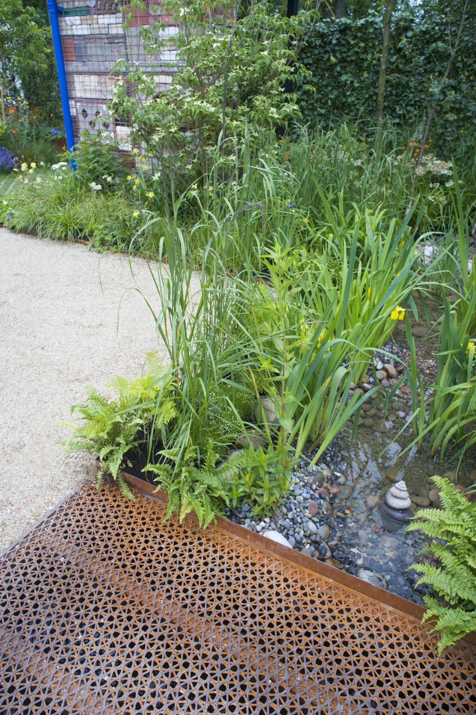 A collaboration with Fingal County Council. A garden directly linked to new design guidance for building developers which demonstrates how biodiversity can be incorporated into housing developments. The design focuses on managing rainwater through using sustainable urban drainage systems (SuDS) while also catering for tree and shrup planting, wildflower meadows, nesting facilities in building facades, green roofs, dead wood and natural play. The garden incorporates elements of a housing estate and follows the passage of rainwater as it is captured and utilised to benefit both wildlife and residents. The rain water’s passage through the garden is visible in stages cut through the garden.